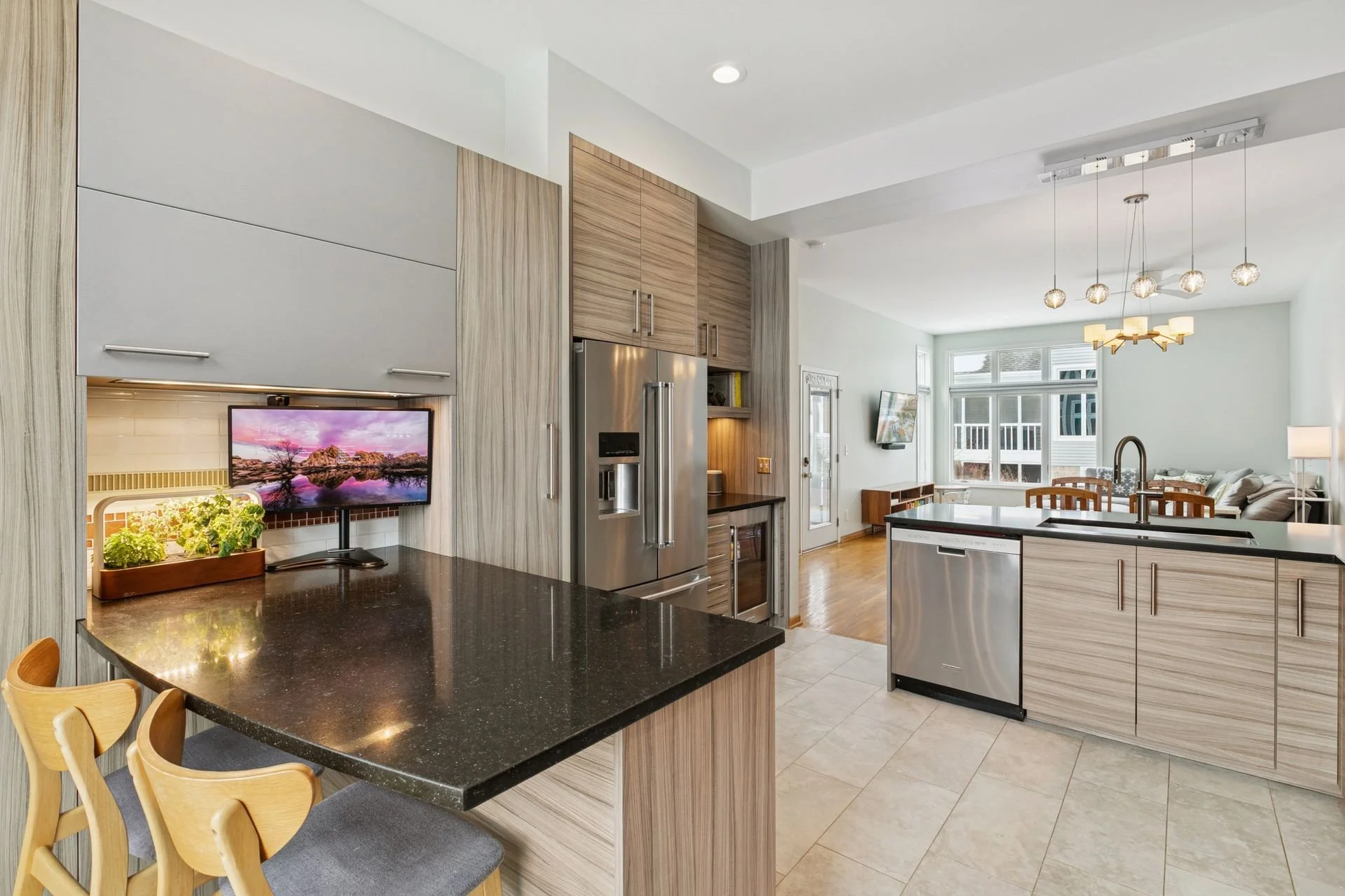 The gorgeous modern kitchen is a show-stopper with custom cabinetry, high-end appliances, and quartz counters. All 3 bathrooms are beautifully updated with tile flooring and shower surrounds. Additional features include huge closets & storage, tall & vaulted ceilings, clerestory windows, and a multi-level floor plan that offer privacy and function for a home office or guests.